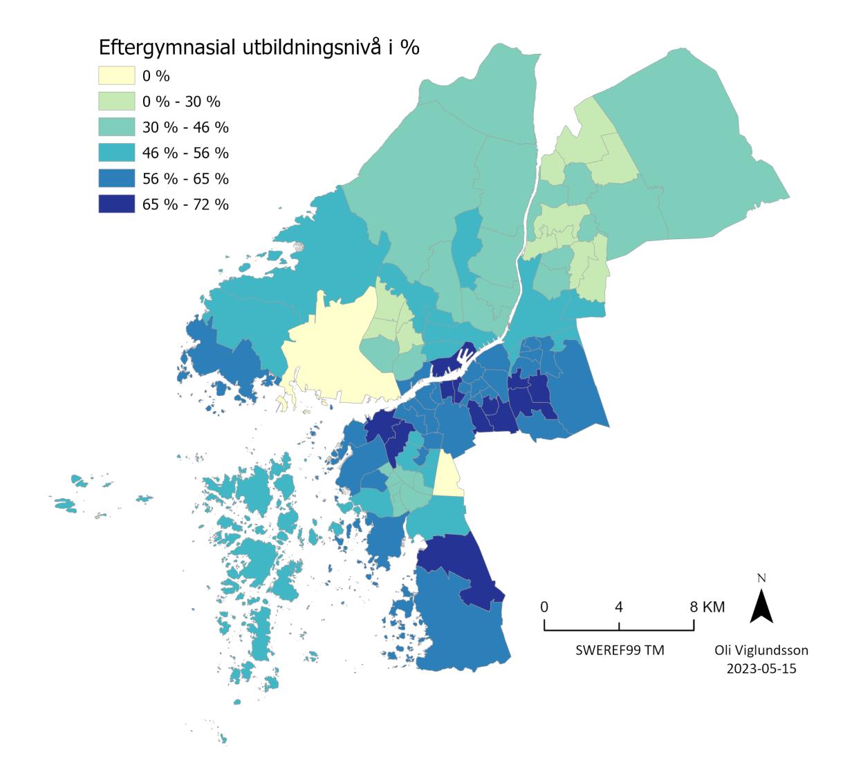 It is clear that the primary areas where the population has a high level of education are also the primary areas that belong to or are in close proximity to the Center. The Northeast and Northern parts of Hisingen, as well as parts of the Southwest, are among the areas of the city with the lowest proportion of the population having post-secondary education. The primary areas with nearly 0% are Arendal and Högsbo; these are industrial areas with very few registered residents (Arendal 48 and Högsbo 63).