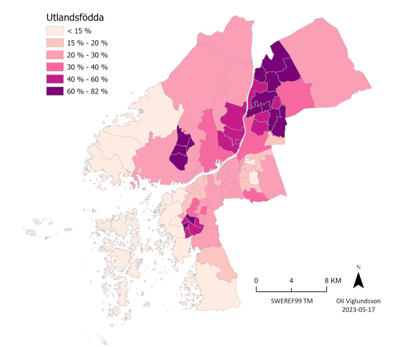 In the map showing the proportion of foreign-born residents, it is also evident that the areas where the average income is lowest and unemployment is highest are also the primary areas with the highest proportion of foreign-born residents.