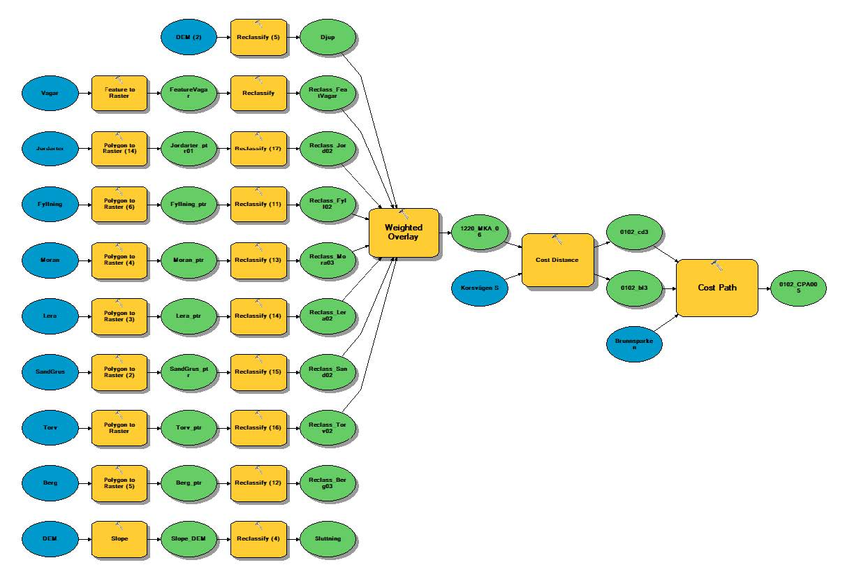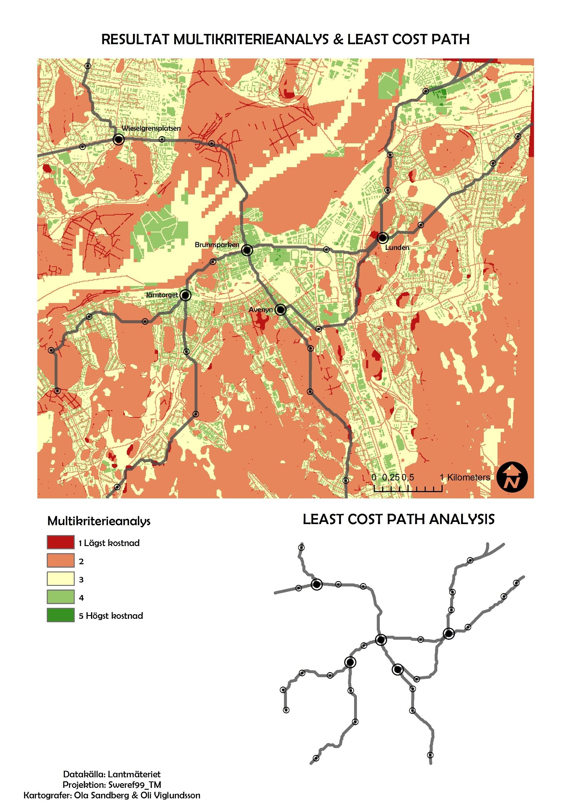 This map is a combination of two results in one map at a scale of 1:40,000, along with a slightly smaller separate overall map of the lines produced with "Cost Path Analysis." The multicriteria analysis takes up the most space and serves as a visual cost basis for where and how it is cheapest or most expensive to build tunnels according to all the collected criteria.