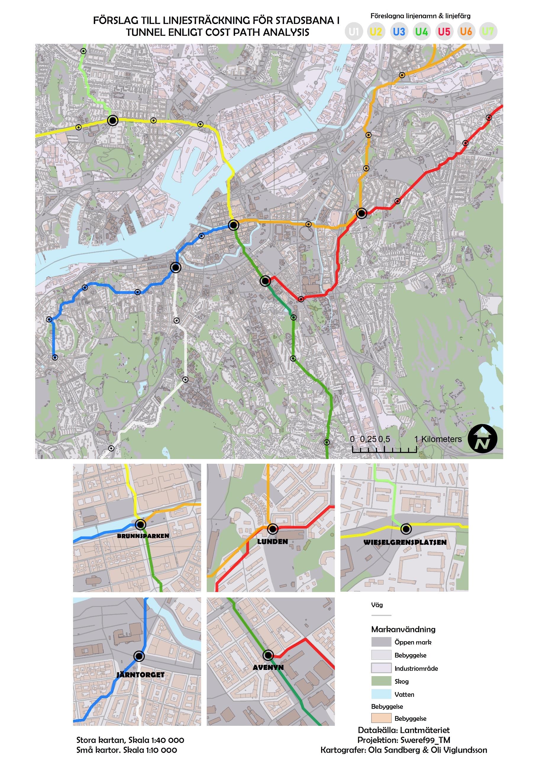 Here is a final visualization of all interventions and analyses conducted. It consists of an overview visualization of the network at a scale of 1:40,000, along with five smaller zoomed-in maps at a scale of 1:10,000 focusing on the branching stations in the network. The land use layer is slightly transparent even in this map to highlight the route lines. The route lines consist of 6 fictional subway lines originating from a couple of main stations in the network.