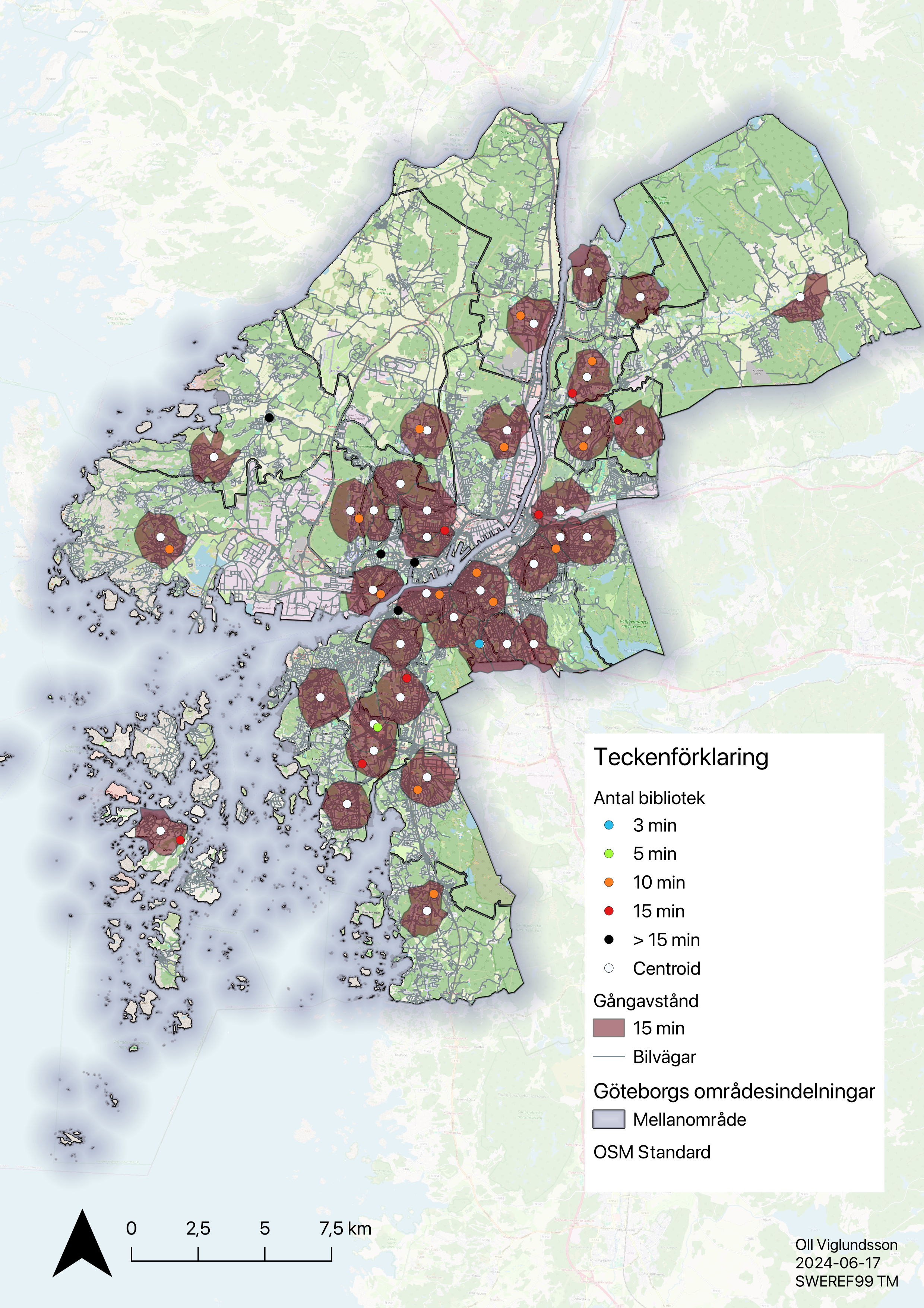Library Access Map: This map displays walking distance to libraries within various areas of Gothenburg, categorized by time intervals.