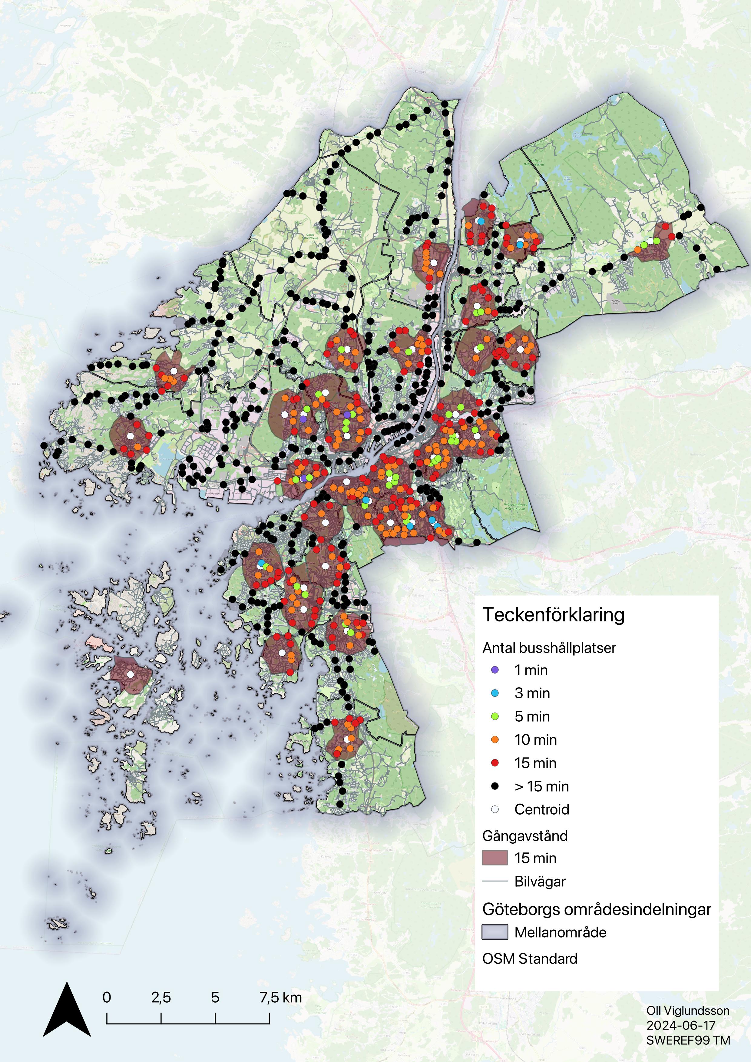 Bus Stop Accessibility Map: This map illustrates the accessibility of bus stops in Gothenburg, highlighting walking distances in minutes.