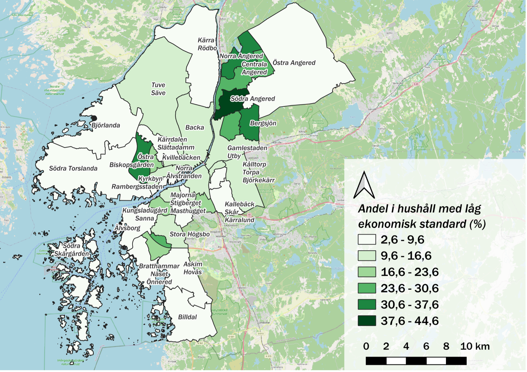 Household Economic Standards Map: This map depicts the percentage of households with low economic standards in various districts of Gothenburg.