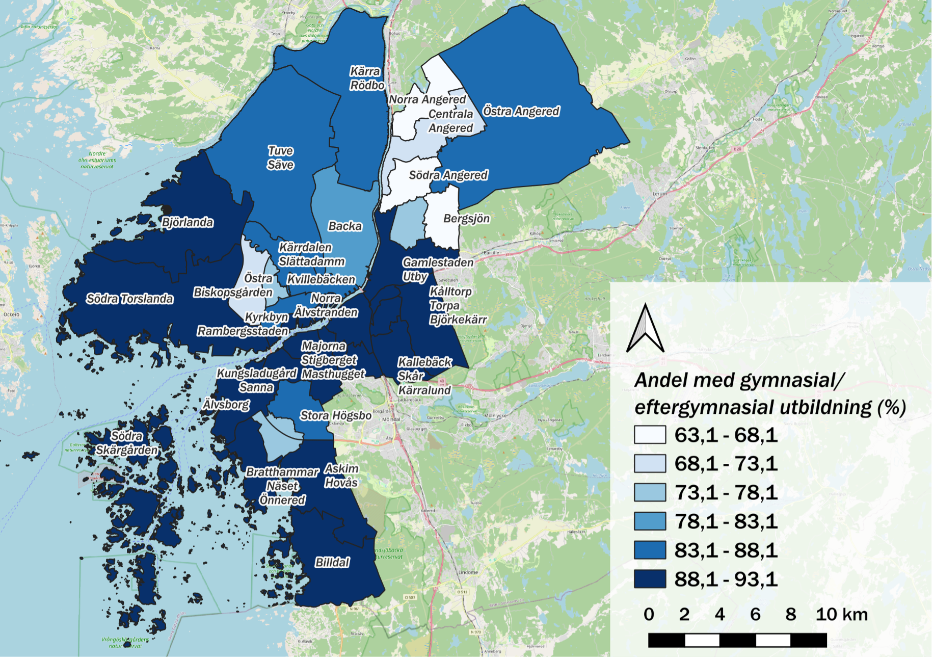 Educational Attainment Map: This map highlights the percentage of the population with high school or higher education across different districts in Gothenburg